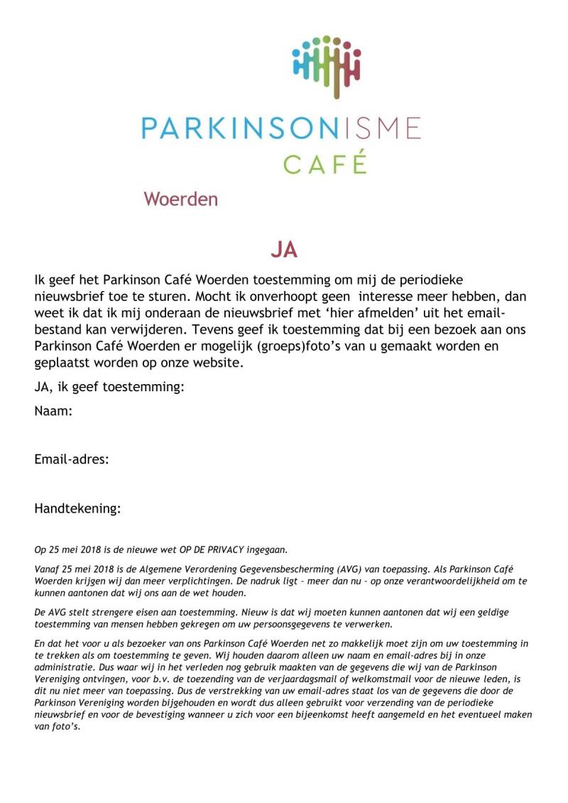 Ja, ik geef het Parkinson Café Woerden toestemming voor verzending van de periodieke nieuwsbrief en voor de bevestiging wanneer u zich voor een bijeenkomst heeft aangemeld en het maken van foto's tijdens deze bijeenkomst.