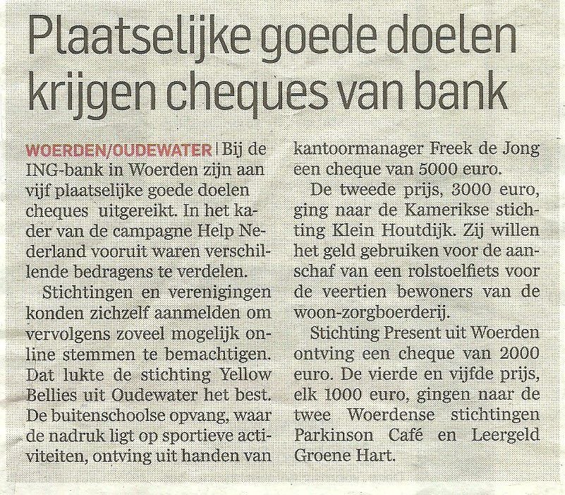 Op 26 maart 2016 heeft het Parkinson Café Woerden uit handen van Freek de Jonge van de ING een prijs van het ING-fonds "Help Nederland vooruit" van € 1.000,-- ontvangen. Het Parkinson Café Woerden is zeer verheugd over deze prijs. Met deze prijs kunnen we weer leuke onderwerpen organiseren.