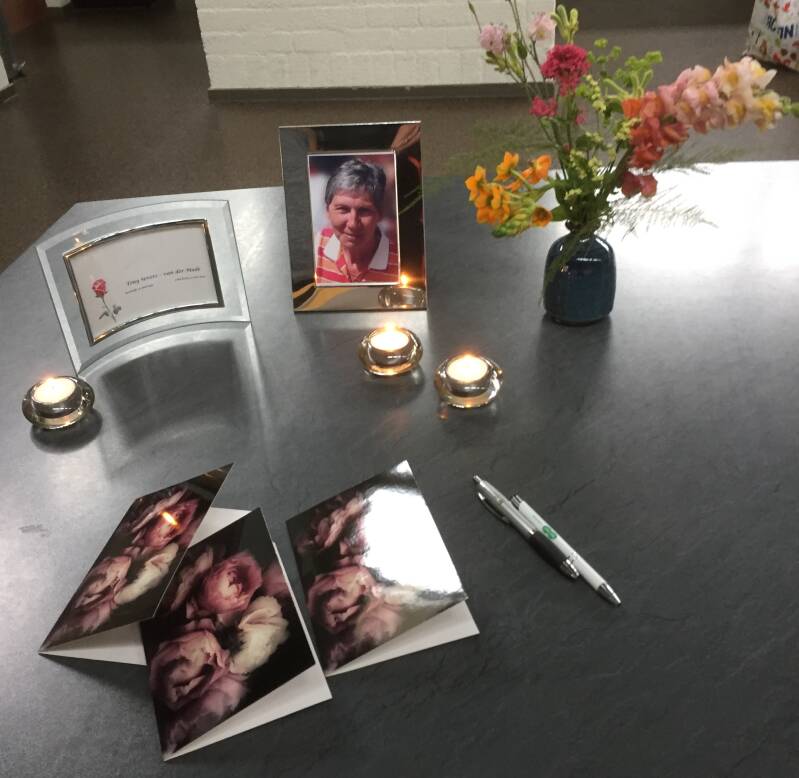 Tijdens onze bijeenkomst was er een herinneringshoekje ingericht waar bezoekers een berichtje voor de familie konden achterlaten. De kaarten zijn intussen naar haar man en kinderen verzonden.