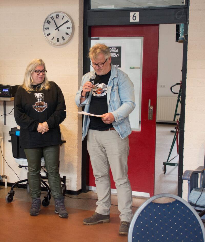Vervolgens wordt het woord gegeven aan Roland van Loenen, voorzitter van de Harley Davidson Club 't Centrum, vergezeld door Yvonne van Vliet van de Stichting A.L.S
