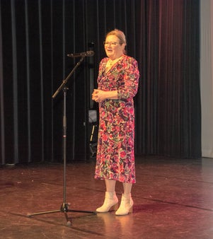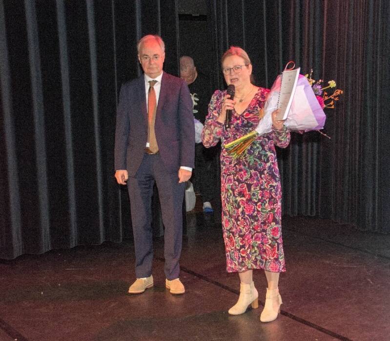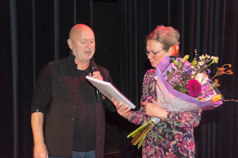 Na afloop van zijn voorstelling werd Hans Holtslag door Annemiek Vonk hartelijk bedankt en kreeg hij een Woerdens presentje en voor zijn partner een bos bloemen uitgereikt.